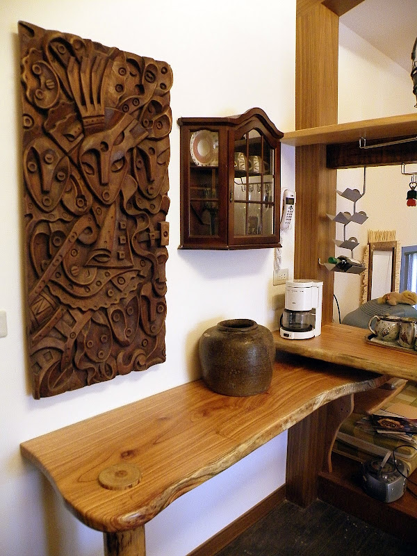 翻修相當滿意。牆上的木雕是南美洲厄瓜多的藝術家作品,有沒有發現每個人都在吹奏樂器呢?