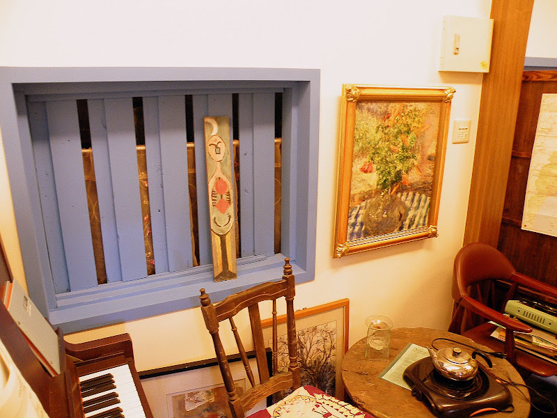 窗戶上的畫是以前港中的美術老師楊自然用漂流木創作的隨性作品,右邊的畫是目前台灣竄起的名家李